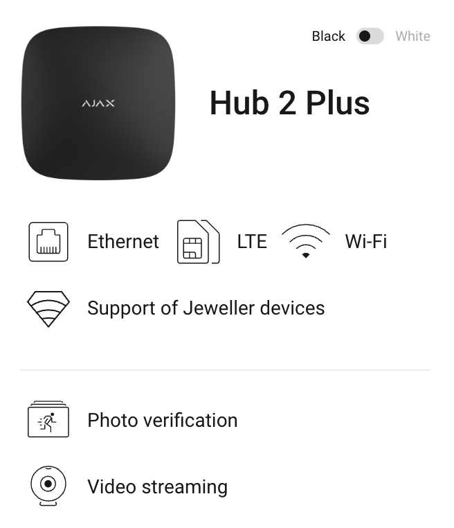 Alte functii: Centrală inteligentă - gestionează detectoarele Ajax și avertizează utilizatorii despre uși deschise, geamuri sparte, inundații, incendiu etc. Transmite fotografii de la detectoarele MotionCam și avertizează utilizatorii. Control total din aplicație, comunică prin 4 canale independente: Ethernet, LTE, Wi-Fi sau utilizând cele doua cartele SIM 2G/3G. Sistemul funcționează chiar și la conexiuni slabe: sistemul funcționează cu o viteză de doar 0,5 kbit/s. Trimite alarme în 0.15s, funcționează până la 15 ore offline, sistem de operare OS Malevich, permite conectarea a max 200 de device-uri, max 100 camere/DVRuri, 200 de useri, 25 partiții, alimentare 110−240 V, baterie backup Li-Ion 3 Ð⋅h. Comunică cu detectorii pe o distanță de până la 2000 de metri în spațiu deschis, comunicare bidirecțională între dispozitive, frecvență de funcționare 868.0-868.6 MHz, temperatura de funcționare −10°Ð¡ ~ +40°Ð¡, dimensiuni 163×163×36 mm.