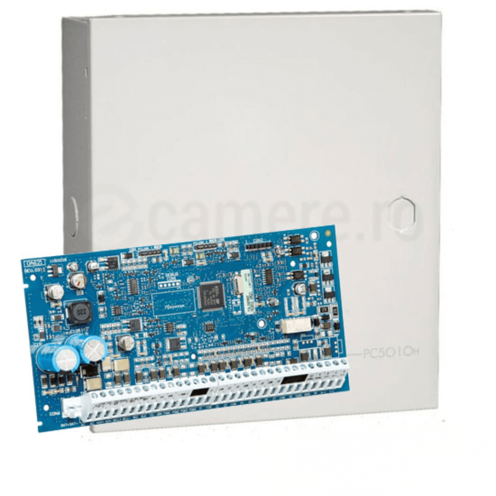 Centrala 8 zone, extensibila la 64 zone cablate sau radio, 8 partitii, memorie 500 evenimente, 95 utilizatori, accepta 8 tastaturi si zone de tastaturi, 4 iesiri programabile extensibila la 70. *** CUTIE PC5003 INCLUSA *** *** OPTIONAL: SEKA GPRS CID - 49 EURO ***