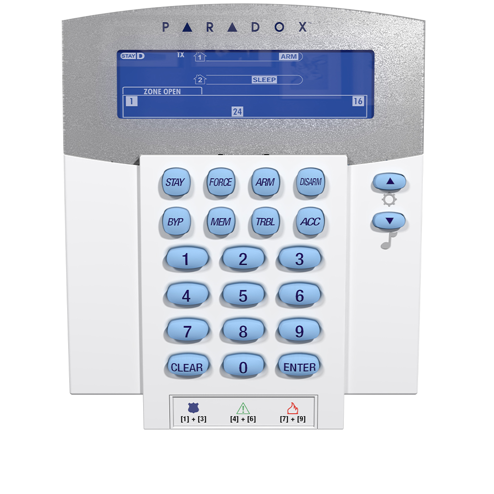Tastatura LCD 32 zone, wireless, alimentare 2x baterii AA si baterie de backup incorporata • afisare in timp real a starii zonelor si sistemului • intră în modul de repaus după 20s pentru a economisi durata de viață a bateriei, dar rămâne sincronizata cu centrala pentru a se activa automat la întârzierea de intrare sau alarmă, oferind funcționalitate completă (stare sistem, afișare zona, sonerie) • afișare mesaje fixe pentru ghidare in operarea sistemului • afisarea starii celor 32 zone, 2 partitii • afisarea starii (armare, repaos, veghe si dezarmat) pentru fiecare partitie • afisare StayD, defecte sistem, zone ocolite si memoria alarmelor • actualizare firmware local via 307USB • iluminare taste ajustabila • transceiver incorporat • raza radio de actiune in mediu rezidential ~40m • 8 butoane de actiune tip