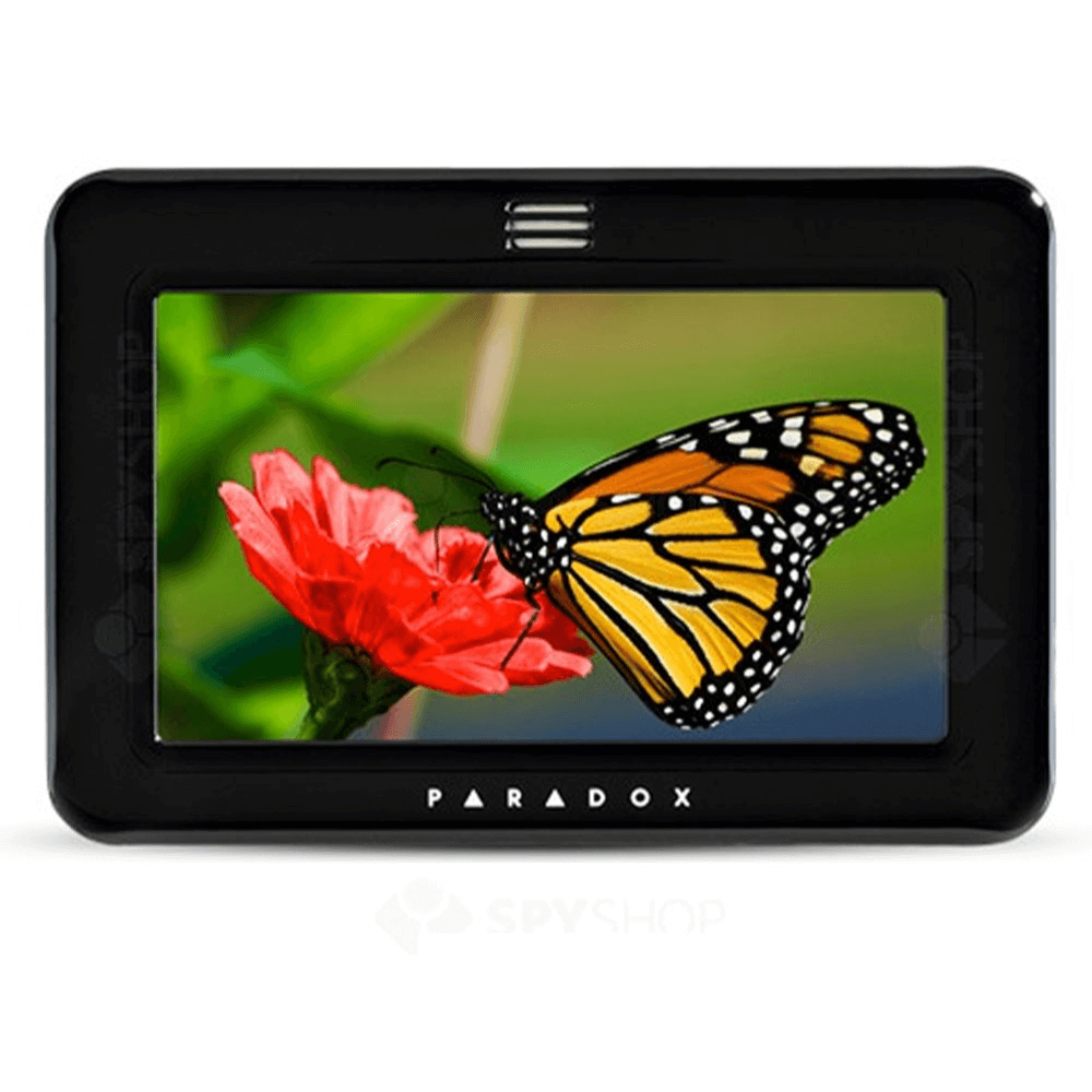 "Modul tastatura Touch Screen cu licenta • compatibilitate: EVO, MG, SP • procesor puternic • LCD ""touch screen"" color, diagonală 12.7cm, rezoluţie: 480x272px • meniuri intuitive pe bază de pictograme grafice • controlul a 8 ieşiri PGM • posibilitate de actualizare firmware local, via micro-card SD • 1 intrare de zonă • dimensiuni: 14.4 x 9.6 x 1.4 cm; doar montare aparentă • etichete personalizabile • culori disponibile pentru rame: negru, alb, verde, roşu, albastru, violet (pe comanda) • culori pe stoc: alb • disponibile facilitati optionale SpotOn Alarm Locator si OneScreen Monitoring - vezi mai jos detalii"