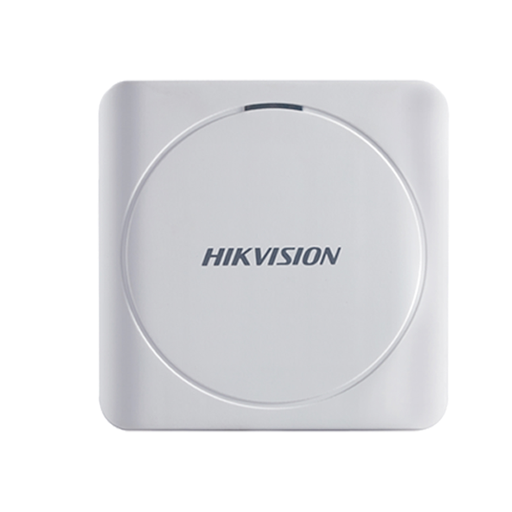 Cititor card Hikvision DS-K1801E, citeste carduri RFID EM 125Khz, distanta citire: 50mm, comunicare: Wiegand 26/34 protocol, indicator LED de stare si alimentare; alimentare: 12VDC, IP65, dimensiuni: 87 × 87 × 13.3mm