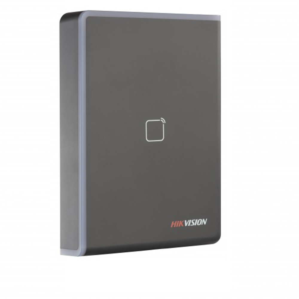 Cititor card Hikvision DS-K1108AE, citeste carduri EM 125 KHz, distanta citire: ≤ 50 mm, comunicare: RS-485, Wiegand (W26, W34) protocol si OSDP protocol, indicator LED de stare si alimentare, tamper, buzzer, alimentare: 12 VDC, IP65, dimensiuni: 123 mm × 88 mm × 21mm