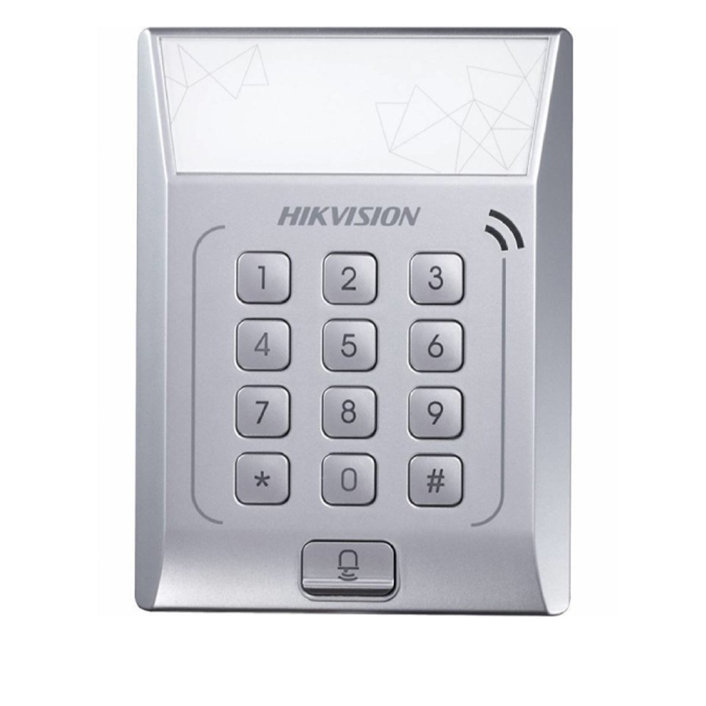 Cititor standalone cu tastatura si card de proximitate Hikvision, DS- K1T801M; suporta cartele MIFARE, Capacitate 3000 cartele, Autentificare: card sau card si parola; Intrari: buton de iesire x1, contact de usa x1; Iesiri: sonerie x1, incuietoare electrica x1; Alimentare: DC 12V/1A; Dimensiuni: 126.5(L)mm x 94.5(W)mm x 24(H)mm