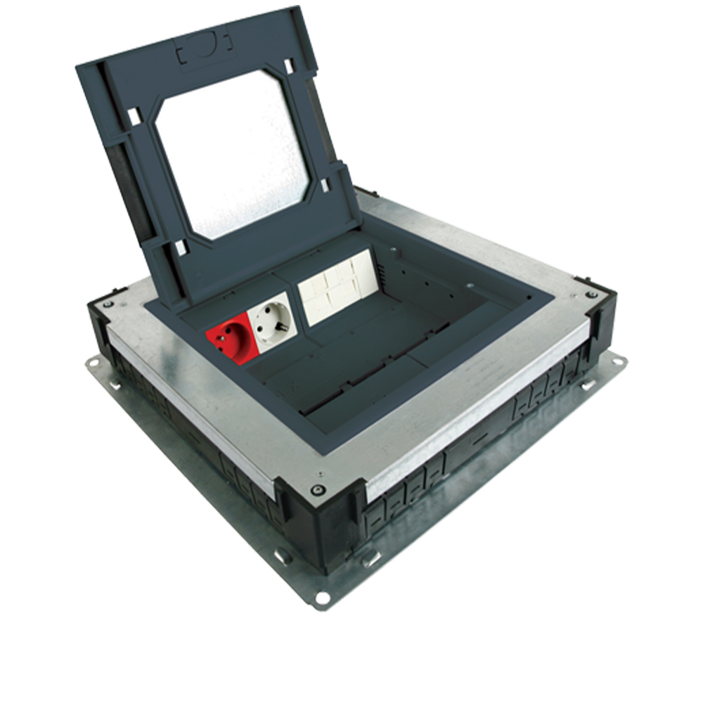 Doza pentru pardoseala cu montare ingropata. Utilizare in aplicatii industriale, spatii comerciale sau de birouri. Pot fi instalate 16 module 45x22.5 mm . Dispune de capac cu placa metalica ce poate fi acoperita cu mocheta, parchet, etc. Capac prevazut cu maner si garnituri de protectie.