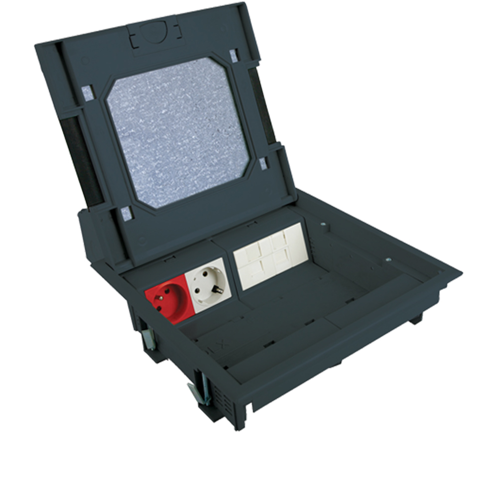 Doza pentru pardoseala cu montare ingropata. Utilizare in aplicatii industriale, spatii comerciale sau de birouri. Pot fi instalate 16 module 45x22.5 mm. Dispune de capac cu placa metalica ce poate fi acoperita cu mocheta, parchet, etc. Capac prevazut cu maner si garnituri de protectie.