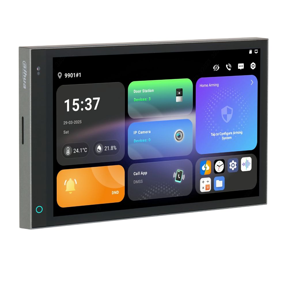 Adopts the Android 14 system, offering advanced performance and a user-friendly experience. Featuring a sleek full-screen design with an ultra-narrow black border, this device combines style and minimalism for an exceptional visual experience. With its 7-inch IPS capacitive touchscreen and multi-touch technology, the screen offers wide viewing angles of up to 80 degrees both horizontally and vertically, significantly enhancing work efficiency and operational flexibility. Supports multiple communication modes including IP, Wi-Fi and IP four-wire. Includes multi-color indicators that feature the breathing light function to keep you updated on status changes. Wakes up automatically when a person approaches for a seamless experience. Equipped with a built-in light sensor, the device automatically adjusts the screen brightness for comfortable viewing. With its built-in temperature and humidity detectors, you can effortlessly monitor the conditions in your house at any time straight from the home screen.