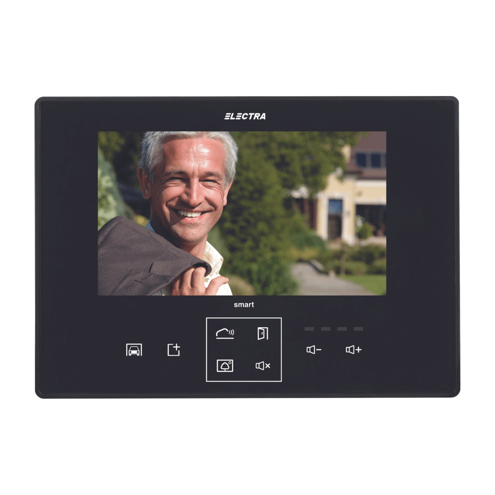 Videointerfonul de interior Electra Smart VTM.7S403.ELB04 are un design elegant cu o suprafata de sticla, ecran TFT-LCD de 7 inch si tastatura tactila (touch) iluminata. Acesta permite comunicare bidirectionala hands-free cu afisare video in timpul apelului, convorbirii sau monitorizarii si dispune de 5 optiuni de sonerie, volum reglabil pe 4 niveluri si optiune "Mute". Acordarea accesului se poate realiza pe durata apelului, convorbirii sau monitorizarii. VTM.7S403.ELB04 este echipat cu 2 taste auxiliare pentru automatizare aditionala (ex. poarta auto, usa garaj, iluminare etc.), include conectori pentru functiile DOORBELL si GONG, si accepta 1 terminal video sau pana la 3 terminale audio in paralel. Carcasa neagra rezistenta, fabricata din material ABS de calitate inalta, confera gradul de protectie IP31 impotriva factorilor externi (apa, praf etc.) si permite functionarea la temperaturi cuprinse intre 0°C si +45°C. Se alimenteaza 11 - 14 Vcc cu un consum standy redus de 9.8 mA si 200 mA in functionare. Videointerfonul se cableaza pe 4 fire si este compatibil doar cu produsele Electra Smart.