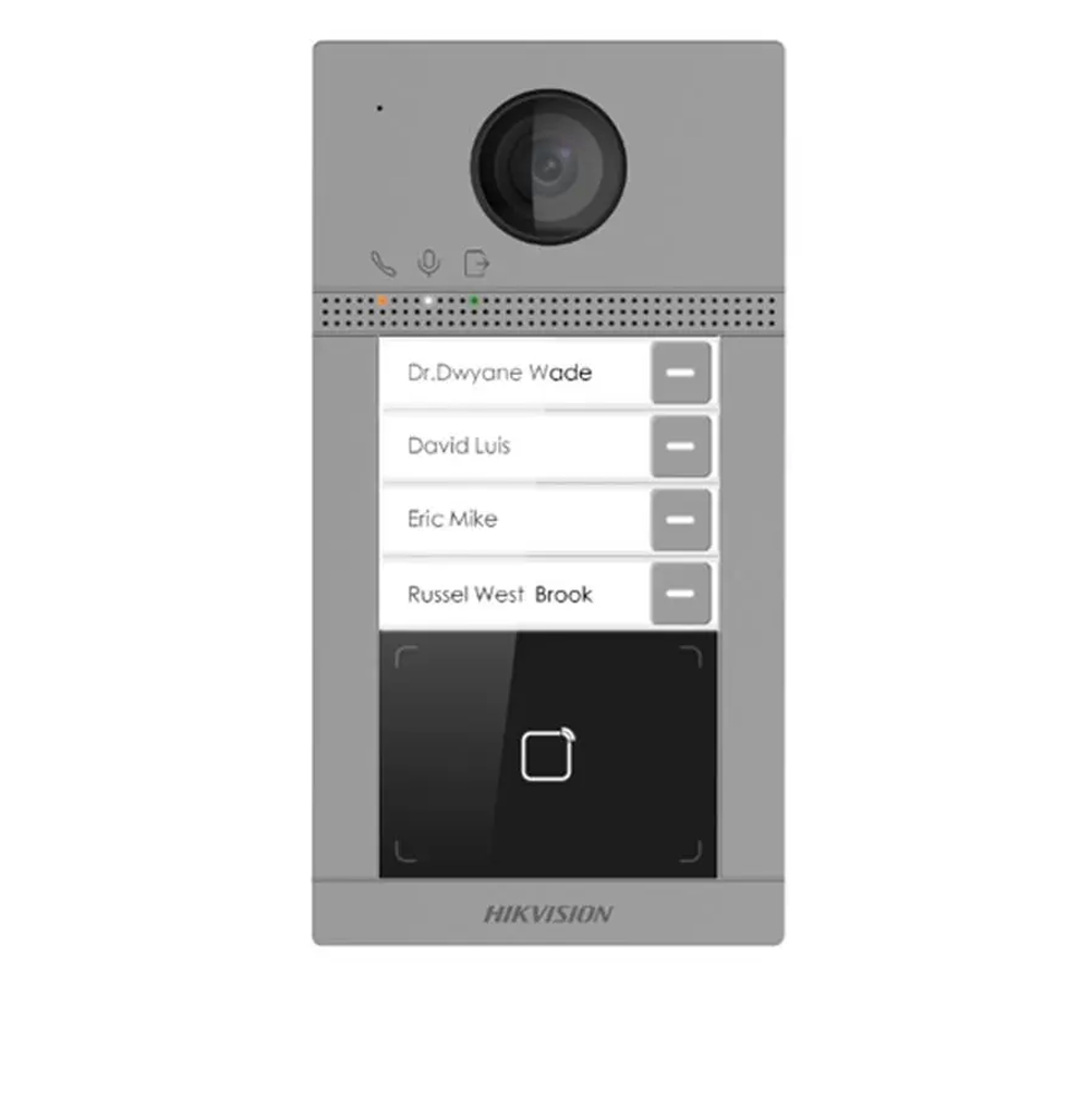Post de exterior videointerfon IP Hikvision DS-KV8413-WME1(C); WIFI; 4 x buton de apelare( pentru o singura familie- permite apelarea a mai multor monitoare de interior); camera video 2MP True WDR ( unghi vizualizare: Horizontal: 124° Vertical: 75°), vizualizare pe timp de noapte IR maxim 3 metri; comunicare audio bidirectionala; cititor de card incorporat pentru carduri Mifare; frecventa de operare: 13.56 MHz; 2 x relee; 1 x RS-485; interfata retea: 10/100 Mbps Ethernet; 2.4 GHz Wi-Fi; configurare de la distanta via web; alimentare: 12VDC si PoE (standard IEEE802.3af );IP65, IK08; temperatura de functionare: -40 °C la +53 °C; dimensiuni: 174 mm × 91 mm × 29 mm; apelare video pe Smartphone sau tableta prin aplicatia HIK-Connect