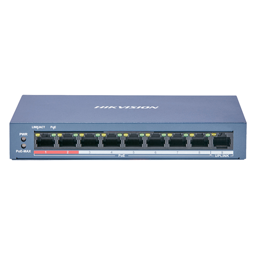 Switch POE 8 porturi Hikvision DS-3E0109P-E©; L2, Unmanaged, 8 × 100 Mbps PoE ports, 1 × 100 Mbps Ethernet port, RJ45 port, full duplex, MDI/MDI-X adaptive, PoE standard:IEEE 802.3af, IEEE 802.3at, Max. port power:30 W, PoE power budget:115 W, Metal material, fan-free design, weight: 0.35 kg, dimension: 170 mm × 27.6 mm × 93.1 mm