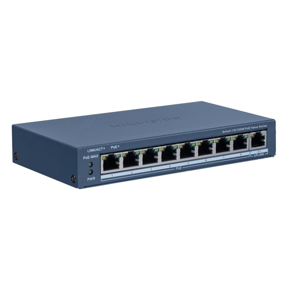 Smart Switch 8 porturi 10/100 Mbps Extended PoE, 1 × Gigabit network RJ45 port; Extended PoE porturile 1-8, transmite alimentare POE si receptioneaza date prin cablu UTP Cat5 la 200 metri catre camere IP Hikvision (Extended mode ON, recomandam limitarea traficului camerei la 6144Kbps), PoE watchdog (reseteaza camera blocata), Smart Topology Management, Health Monitor, Push Alarm, 3.6 Gbps Switching, 8K MAC address table, Buget total PoE 60W, maximum 30W/port; 4 kV Surge Protection, carcasa metalica, fan free, dimensiuni 170 mm × 27.6 mm × 93.1 mm; temperatura de functionare -10℃-40℃.