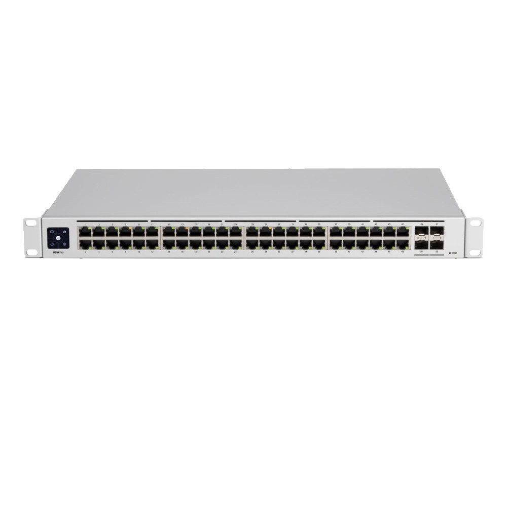 Ubiquiti UniFi pro switch, USW-PRO-48, 48 x Gigabit RJ45 ports, 4 x 10G SFP+ ports, Layer 2 and Layer 3 features, 1.3" touchscreen display, Switching Capacity: 176 Gbps, Forwarding Rate: 130.944 Mpps, Max Power Consumption: 60W.