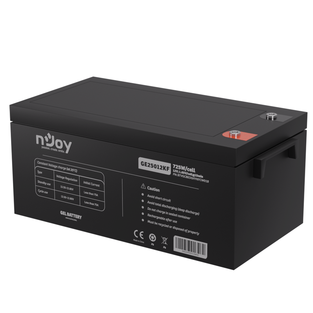 • NJoy GE25012KF este un acumulator VRLA tip gel, de 12V, produs de NJoy pentru aplicații de alimentare de rezervă și sisteme continue. Fiind complet sigilat și fără întreținere, este ideal pentru instalații de supraveghere video, UPS, echipamente de comunicații și sisteme solare.