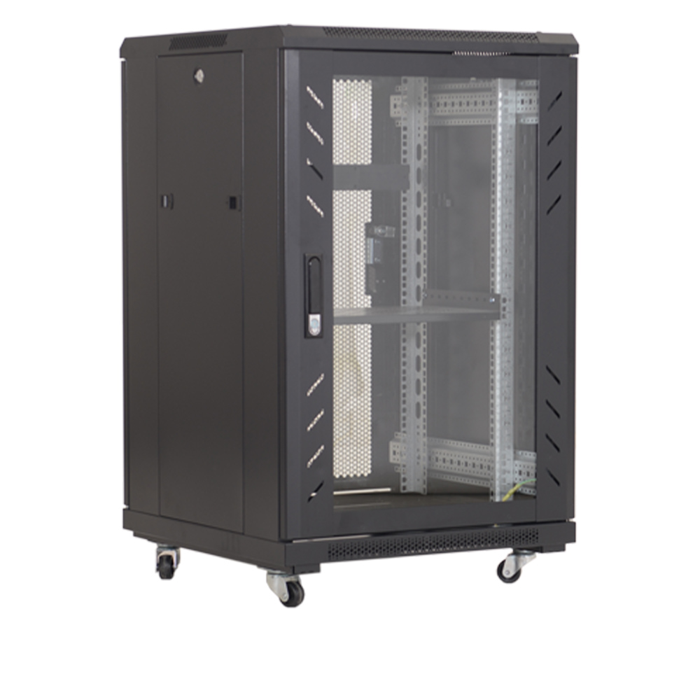 Usa din sticla securizata, prevazuta cu incuietoare metalica, deschidere 180° confectionat din tabla de otel laminat la rece, fosfatata, vopsita in camp electrostatic montanti fata-spate numerotati, pentru echipamente si accesorii de 19 inch panouri laterale detasabile roti pentru mobilitate contine toate accesoriile necesare asamblarii complete capacitate de incarcare excelenta acces cabluri din 3 directii (tavan, podea, spate) 2 ventilatoare incluse
