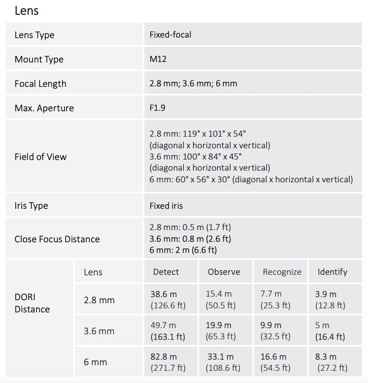 Camera DAHUA HAC-HFW1200TL-A-28 are o lentila ce ofera un unghi fix de vizualizare, ce nu poate fi reglat in momentul instalarii acesteia, fiind pretabila in supravegherea generala a zonelor. Distanta focala este de 2.8 mm, oferind un unghi orizontal de 103.0°.