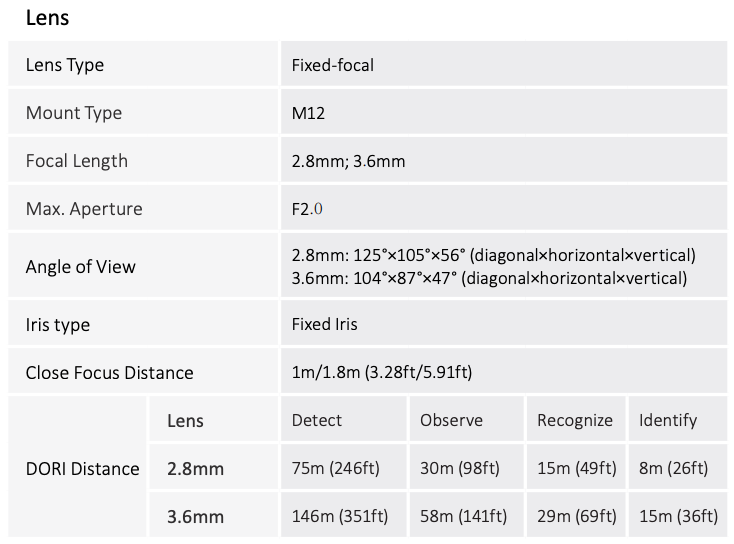Camera DAHUA HAC-HDW1801M are o lentila ce ofera un unghi fix de vizualizare, ce nu poate fi reglat in momentul instalarii acesteia, fiind pretabila in supravegherea generala a zonelor. Distanta focala este de 2.8 mm, oferind un unghi orizontal de 105.0°.