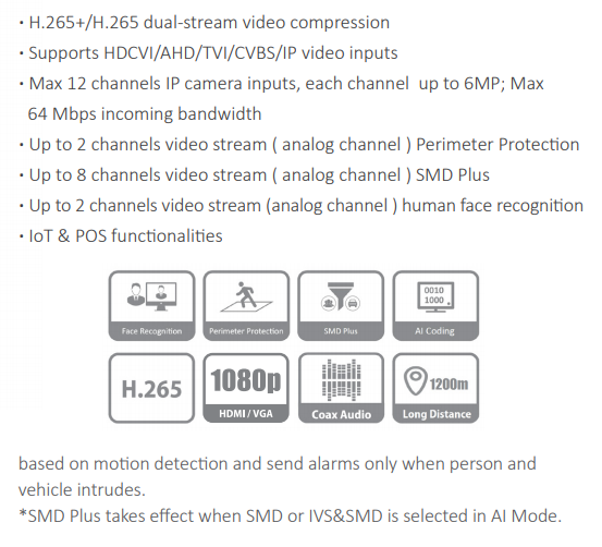 | Alte functii | - Suporta camere de 5MP pe primele doua canale - Căutare inteligentă și Funcții IVS - Permite Detectie Miscare Inteligenta (SMD Plus) pe toate canalele - Perimeter Protection pe 2 canale - Face Detection 2 canal - Face Recognition 2 canal - Codare AI pe toate canalele, ce reduce pana la 50% stocarea fata de compresia H.265 standard - Cand functia SMD este activata, doar aceasta este disponibila, restul neputand fi activate - Cand functia "Face" este activata, doar Face Detection sau Face Recognition pot fi activate |