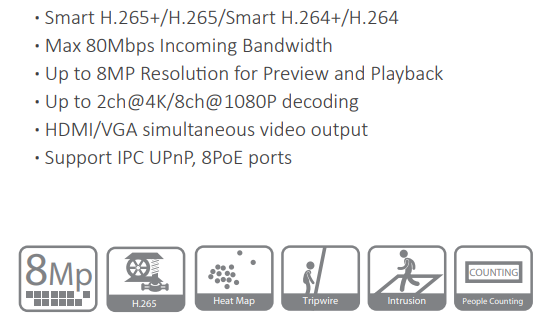 DAHUA NVR4108HS-8P-4KS2 este un NVR cu 8 canale video, ce poate inregistra imagini provenite de la camere IP de supraveghere, ce au o rezolutie maxima de 8 Megapixeli, in limita a 80 MB/secunda, pe intreg sistemul.