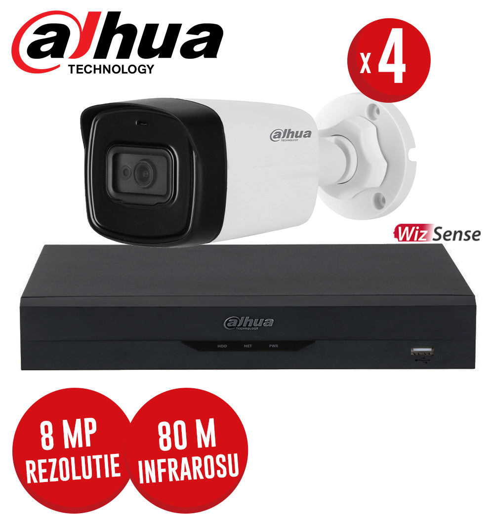 Sistemul de supraveghere video "PACHET DVR 4 CANALE 8MP SI 4 CAMERE 8MP, IR 80M, SMD PLUS, AUDIO, WIZSENSE - KIT229", contine DOAR urmatoarele echipamente: