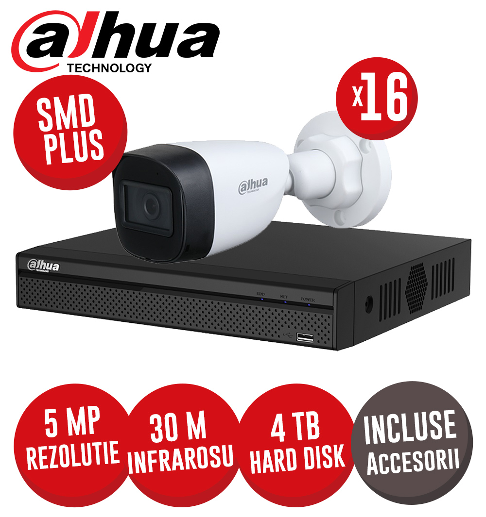 Sistemul de supraveghere video "SISTEM COMPLET DVR 16 CANALE 5MP, 16 CAMERE 5MP, IR 30M, ACCESORII, CABLU UTP - KIT334", contine DOAR urmatoarele echipamente: