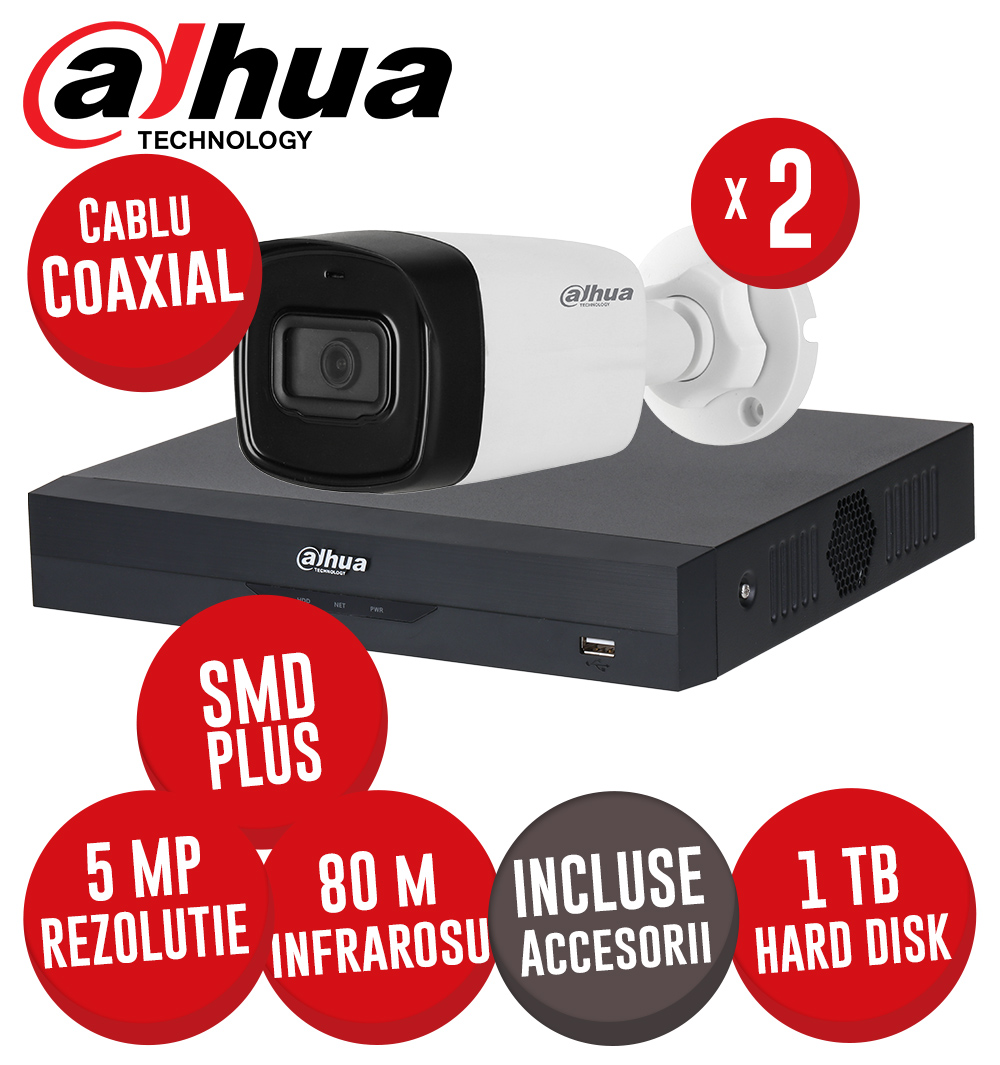 Sistemul de supraveghere video "SISTEM COMPLET DVR 4 CANALE 5MP-N, 2 CAMERE 5MP, IR 80M, SMD+, AUDIO , ACCESORII, COAXIAL - KIT458", contine DOAR urmatoarele echipamente: